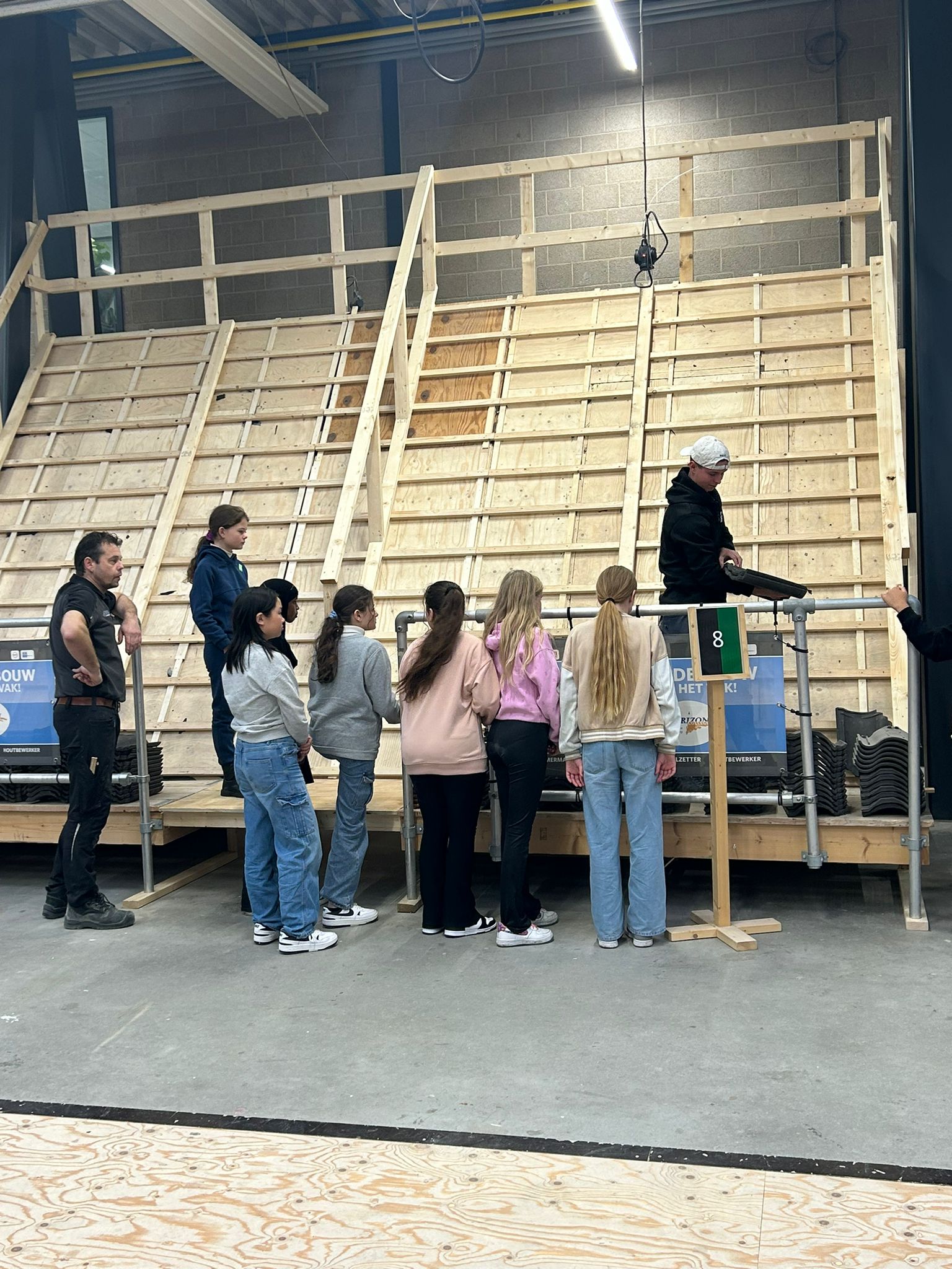 Bij binnenkomst verrijst er voor de leerlingen al een groot dak waarop de deelnemers in 10 minuten tijd tientallen dakpannen kunnen leggen. En hup, de hoogte in en ook nog eens proberen de pannen strak in 1 lijn te leggen, 3 rijen dik!