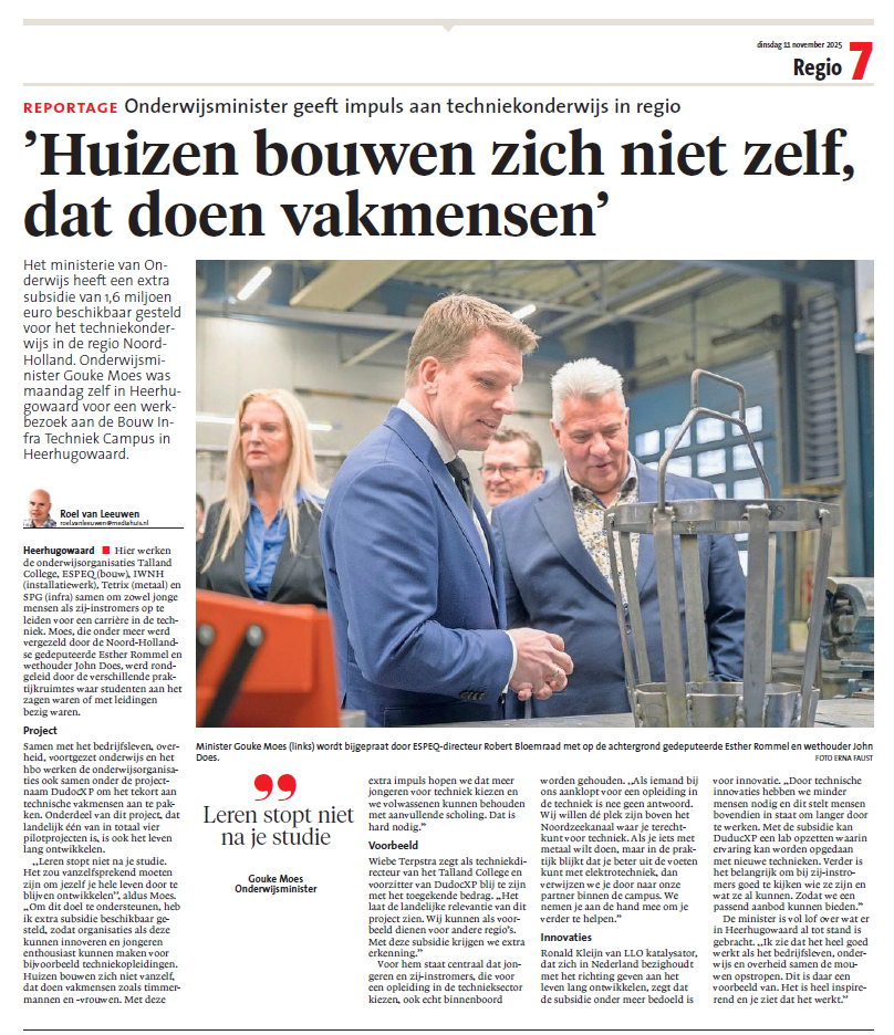 Met trots ontvingen wij 10 november 2025 minister Gouke Moes op de Bouw Infra Techniek Campus. Hij kreeg een kijkje in onze samenwerking met Tetrix, SPG en IW, waar we dagelijks werken aan het opleiden van nieuwe vakmensen. Een mooie erkenning voor het belang van technisch onderwijs in onze regio.
